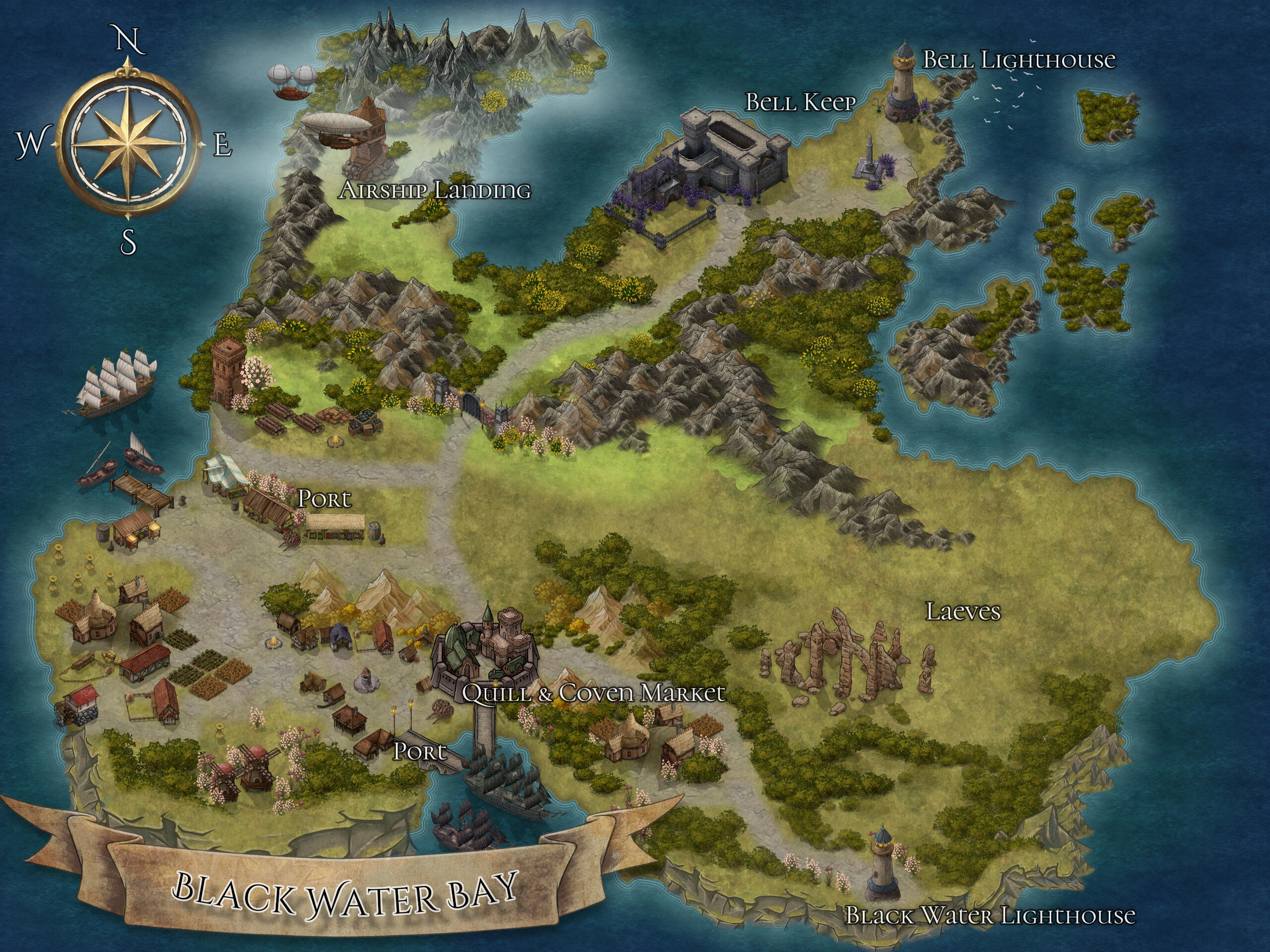 An Island that was purchased from three noble Lords of Ishgard who each sold their land and shares of the Island to House Cress. It is said that the Lady Cress has finished construction of the port on this vast portion of land. It is said to have a small tavern, lodgings, and warehouses specifically built to accommodate travelers, and provide work in and around the port itself and it is open to all sorts of travelers finding their way to partake in trade or to have something transported. There is a local market within the center of the port called The Quill & Coven, generally a night market of sorts where peddlers from all over sell their taboo and unique items. Some artifacts, obscure and cursed in make, exotic goods that some might find difficult to find, and other times, rare charms or mere artisan items from gifted crafters.As of late, the Lady Cress and her family have taken up residence on the Island of Black Water Bay near the Northern most part of the Island itself in Bell Keep.